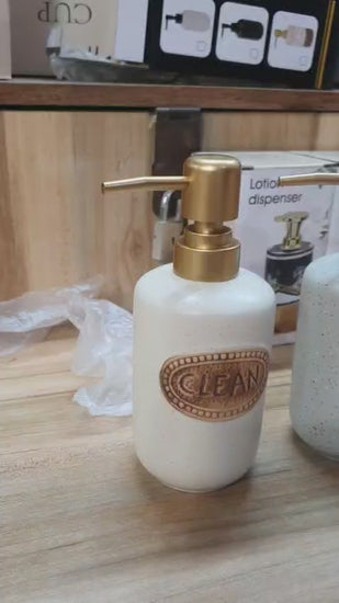 - Material: The bottle is made of durable ceramic or porcelain with a speckled finish. The pump mechanism is typically a gold-colored, rust-proof plastic or stainless steel alloy.