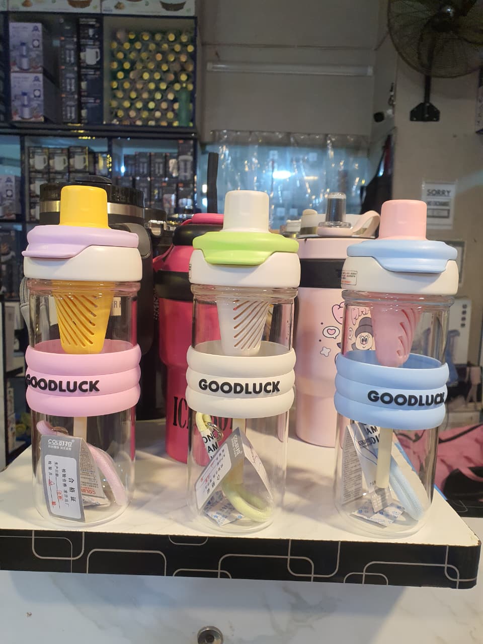 The Goodluck Glass Cup is a reusable glass tumbler with a lid and straw, designed for holding various cold and hot beverages. It is made of high-quality, heat-resistant glass and features a silicone grip band.